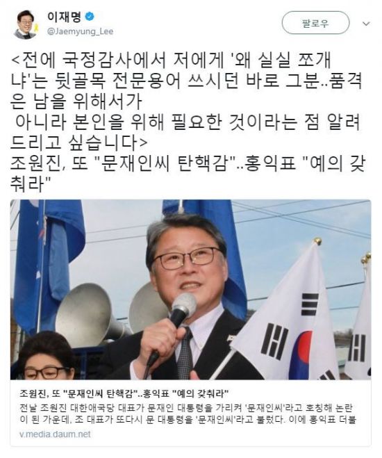 조원진 대한애국당 대표가 문재인 대통령을 ‘문재인 씨’로 지칭해 논란이 된 가운데, 이재명 성남시장이 “품격은 남을 위해서가 아니라 본인을 위해 필요한 것이라는 점 알려드리고 싶다”며 일침을 가했다. 이 시장은 12일 자신의 트위터에 조 대표 관련 기사를 링크하고 “전에 국정감사에서 저에게 ‘왜 실실 쪼개냐’는 뒷골목 전문용어 쓰시던 바로 그분”이라며 지적했다.한편 조 대표는 11일 정당정책토론회에서 “문재인 정부 6개월 만에 안보·한미동맹이 무너지고 경제 파탄 징후가 보인다”며 “문재인씨가 제대로 하고 있는가, 그렇지 않다고 본다”고 주장한 뒤 12일에도 “(지난 10월21일) 흥진호가 (북한에) 나포당했다는 사실을 대통령이 모르고 야구 시구를 하러 갔는데 문재인 씨의 문제가 심각하다”며 “(나포당했다는 사실을) 알고 갔다면 탄핵감”이라고 말해 논란이 불거진 바 있다. 온라인이슈팀 issue@asiae.co.kr<ⓒ세계를 보는 창 경제를 보는 눈, 아시아경제(www.asiae.co.kr) 무단전재 배포금지>