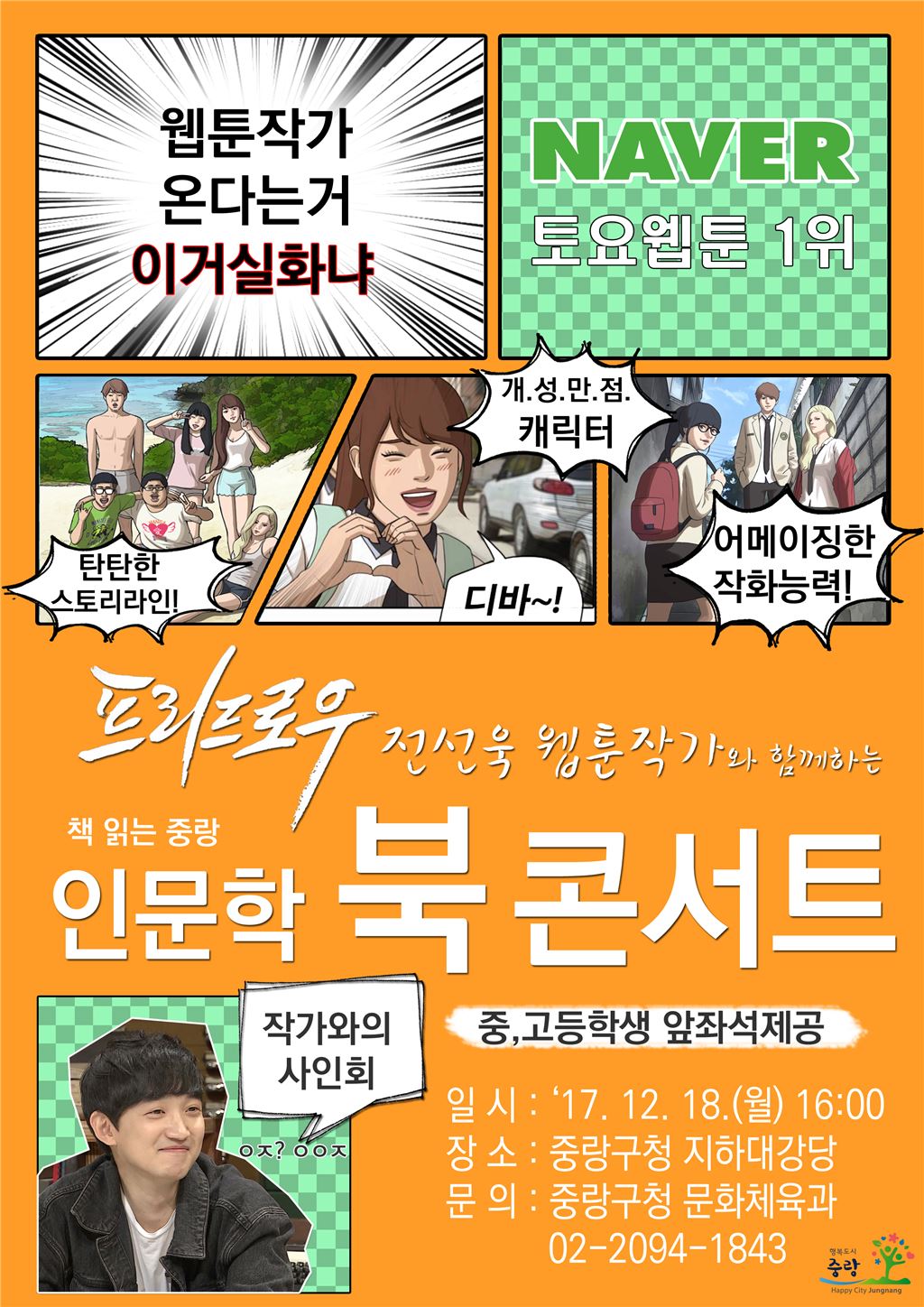 '인생이라는 도화지에 누군가 그려주는 대로 혹은 그려진 대로 살지 말고 자신이 원하는 대로 자유롭게 그리면서 살아라’라는 메시지를 전하기 위해‘프리드로우(free+draw)’라는 제목을 정했다는 전선욱 작가는 미래를 고민하는 청소년들에게 하고 싶은 일을 어떻게 찾아나가야 할지에 대한 조언과 방향을 제시, 청소년들과 소통하는 시간을 가질 예정이다. 이날 북 콘서트에서는 전문 독서토론 강사인 김신의 심도 있는 진행과 함께 책을 노래하는 북 뮤지션의 신나는 음악공연도 함께 펼쳐진다. 강연 후에는 저자 사인회와 기념촬영도 함께 진행돼 더욱 뜻깊은 시간이 될 전망이다. 박호동 문화체육과장은 “그동안 다양한 저자의 북 콘서트 진행을 개최했으나 웹툰 작가와 북 콘서트는 이번이 처음”이라며“다양한 연령대의 주민들이 책의 한 장르인 웹툰과 친해지는 좋은 기회가 될 것으로 기대한다”고 말했다. 박종일 기자 dream@asiae.co.kr<ⓒ세계를 보는 창 경제를 보는 눈, 아시아경제(www.asiae.co.kr) 무단전재 배포금지>