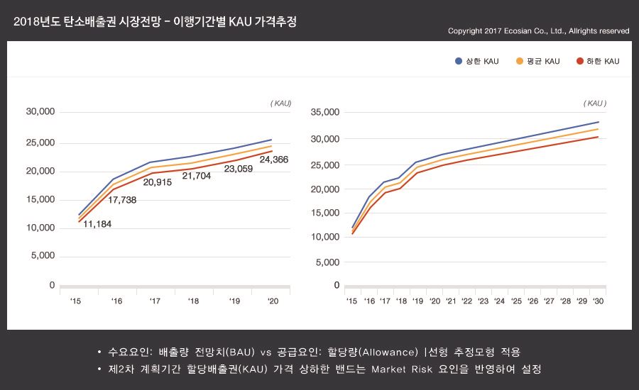 [아시아경제 배경환 기자] 친환경·에너지 컨설팅 전문기업 에코시안이 '국내 탄소배출권 시장전망 및 투자전략에 대한 연간 리포트'를 발간했다.에코시안이 국내 최초 설립한 탄소배출권 리서치센터에서 발표한 이번 연간 리포트는 ▲2018년도 경제전망 ▲탄소배출권 시장현황 ▲제1차 계획기간 수급분석 ▲대응 및 투자전략 ▲제2차 계획기간 중 2018년도 업종별 할당량 추정 ▲2018년도 탄소배출권시장 연간전망으로 구성됐다.보고서에 따르면 2018년 상반기는 제1차 계획기간이 종료되는 시점으로 탄소배출권의 가격변동성은 확대될 전망이다. 2015~2016년에 걸쳐 배출권이 부족한 업체들은 대부분 차입대응으로 일관한 까닭에 잠재적 매수세는 상당할 것으로 분석했다. 반면 이월한도 제한에 따른 초과물량과 정부보유 시장안정화물량(MSR:Market Stabilization Reserve)은 부족분을 해결할 수 있는 유일한 공급원으로 꼽혔다. 문제는 공급물량이 본격적으로 출회되는 시점이 매우 불확실하다는 것이다. 수급상 미스-매칭 부분은 정부의 보유물량(MSR)으로 일정부분 조기해소를 권장하고 있다.연간전망 리포트에 따르면 제1차 계획기간 동안 배출권 수요는 166억6700만톤, 공급은 168억6000만톤으로 1차 계획기간의 과부족은 2억400만톤 잉여로 추정하고 있으며 이월한도를 초과한 물량은 명세서 제출이 마감되는 내년 1분기 이후에 출회될 것이라고 전망했다.2018년도 총 할당량은 5억3846만톤으로 추정하는 가운데 발전에너지 2억2880만톤, 철강 1억232만톤, 석유화학 4772만톤, 시멘트 4351만톤, 정유 1926만톤으로 추정했다. 글로벌 경기 펀더멘털 상승세와 맞물려 제2차 계획기간에도 고질적인 수급 불균형 현상은 지속될 것으로 분석했다. 수급 불균형 해소에 대한 해법으로 이월한도 제한을 기존 10%+2만톤에서 5%+1만톤 축소를 제시했다. 김태선 리서치센터장은 "지난 11월 24일, 배출권 가격이 톤당 2만8000원으로 사상최고치를 연이어 경신하자 정책당국은 전격적으로 구두개입을 단행했다"며 "이후 배출권 가격은 연이어 하한가를 기록하며 급락행진을 보이는 등 당국의 가격하향 안정화에 대해 명확한 시그널을 보여주었다"고 설명했다. 이어 "2018년 2분기에 공급물량이 출회된다면 배출권 가격 하락의 낙폭은 확대될 것으로 전망된다"고 내다봤다.한편 2018년도 탄소배출권시장 연간전망 및 투자전략 자료에 대한 요약본은 분기별로 할당배출권인(KAU)의 가격 상하한 밴드를 제시하고 있고 지난 11월 1일 오픈한 탄소배출권 금융공학&리서치센터 홈페이지에서 조회가 가능하다.배경환 기자 khbae@asiae.co.kr<ⓒ세계를 보는 창 경제를 보는 눈, 아시아경제(www.asiae.co.kr) 무단전재 배포금지>