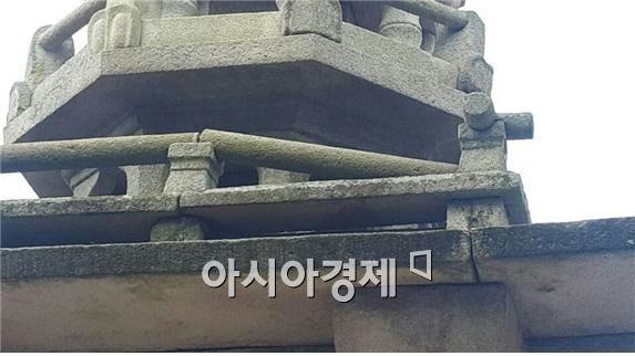 [아시아경제 김종화 기자]지난해 11월 15일 오후 2시 29분 경 경북 포항시 북구 북쪽 6㎞ 지점에서 발생한 규모 5.4의 지진에 유명 브랜드의 아파트들은 금이 가거나 절반 쯤 무너져 못쓰는 건물이 됐습니다. 그러나 같은 활성 단층 대에 위치한 인근 경주의 불국사는 끄떡 없었습니다.진도 5.8의 지진에 불국사 다보탑 난간석 하나가 비틀려 떨어진 모습.