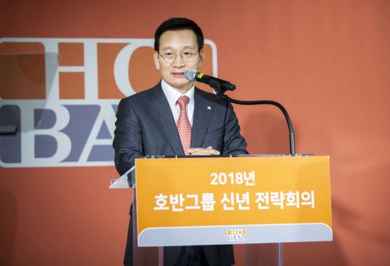 ▲김상열 호반그룹 회장이 5일 서울 종로구 당주동 포시즌스호텔에서 열린 ‘2018 호반그룹 신년 전략회의’에서 신년사를 하고 있다.