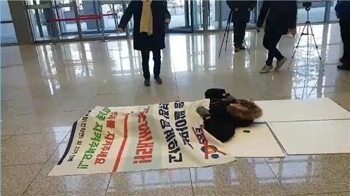 5일 EBS 사옥 로비에 드러누운 학부모 [이미지출처=연합뉴스]