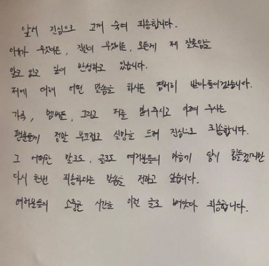 그룹 씨엔블루 정용화가 대학원 입학 논란과 관련해 자필 사과문을 게재했다.17일 정용화는 자신의 인스타그램에 경희대학교 대학원 박사과정 입학과 관련해 “진심으로 고개 숙여 죄송하다. 이유가 무엇이든, 진실이 무엇이든, 모든 게 제 잘못임을 알고 있고 깊이 반성하고 있다”고 밝혔다.정용화는 이어 “저에 대해 어떤 말씀을 하시든 겸허히 받아들이겠다”며 “가족, 멤버들 그리고 저를 믿어주시고 아껴 주시는 팬분들께 정물 부끄럽고 실명을 드려 진심으로 죄송하다”고 전했다.그러면서 그는 “어떤 말로도, 글로도 여러분들의 마음에 닿기 힘들겠지만 다시 한번 죄송하다는 말씀 전하고 싶다. 여러분들의 소중한 시간을 이런 글로 빼앗아 죄송하다”며 재차 사과했다.앞서 16일 SBS는 유명 아이돌 가수가 대학원 입학 면접에 두 차례 불참했음에도 최종 합격했다고 보도했다. 현재 이 아이돌 가수는 정용화로 밝혀졌다.한편 정용화의 소속사 FNC엔터테인먼트는 “아티스트는 바쁜 일정 때문에 소속사가 모든 일정을 정한다. 이번 대학원 입학 또한 소속사가 처리한 것”이라는 입장을 전했다.온라인이슈팀 issue@asiae.co.kr<ⓒ세계를 보는 창 경제를 보는 눈, 아시아경제(www.asiae.co.kr) 무단전재 배포금지>