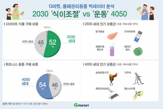 G마켓, 세대별 몸매관리 성향조사젊은층은 식이조절로 단기간 체중감량 선호, 중장년층은 건강 고려 운동에 관심4050 체력소모 적고 유산소 운동 선호승마기구, 러닝머신, 헬스사이클 등 4050고객 과반 넘어