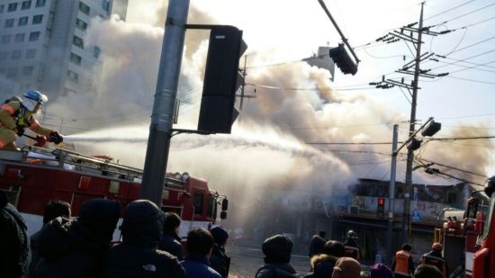 27일 오전 11시 15분쯤 서울 영등포구 문래동 영일시장 입구에서 불이 나 소방당국이 진화하고 있다. (사진=연합뉴스)