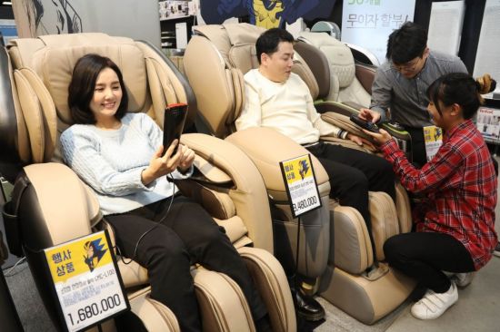 8일 오전 일렉트로마트 영등포점에서 한 가족이 안마의자를 체험하고 있다.