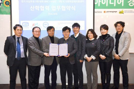 좌측부터 최현수 안산사회적경제지원센터장, 한양대 ERICA 김재곤 LINC+사업단 교수, 한국산업기술대 조진기 LINC+사업단장, 카톨릭대 이동현 LINC+사업단장, 윤기영 시흥사회적경제지원센터장, 홍승미 부천사회적경제지원센터 국장, 한국산업기술대 조남주 창업교육센터장, 카톨릭대학교 라준영 교수