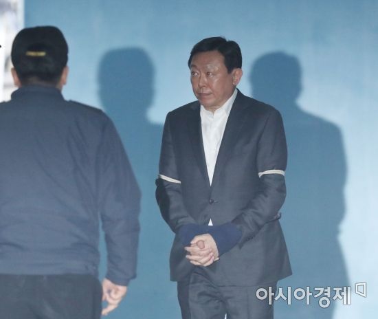 '최순실 게이트' 연루 혐의로 재판에 넘겨져 1심 선고공판에서 징역 2년 6개월과 추징금 70억원을 선고받고 법정구속 된 신동빈 롯데그룹 회장이 13일 서울 서초구 서울중앙지방법원을 나서고 있다. /문호남 기자 munonam@