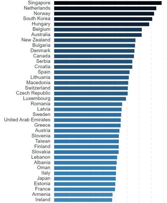 글로벌 4G LTE 평균속도 순위. 한국은 40.44Mbps로 세계 4위에 올랐다. [자료=Opensignal]
