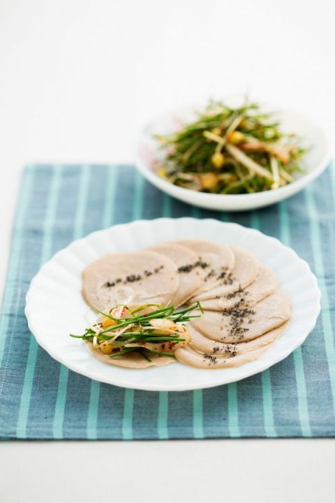 ▷주재료(2인분)달래 1/2단(50g), 양파 1/6개, 메밀가루 1컵, 물 1컵+1/5컵, 식용유 적당량, 참기름ㆍ통깨 약간씩▷양념 재료액젓 2, 고춧가루 0.5, 식초 1.5, 설탕 1▷만들기★ 요리 시간 30분1. 달래는 다듬어 씻어서 물기를 빼서 3cm 길이로 썰고 양파는 곱게 채 썬다.