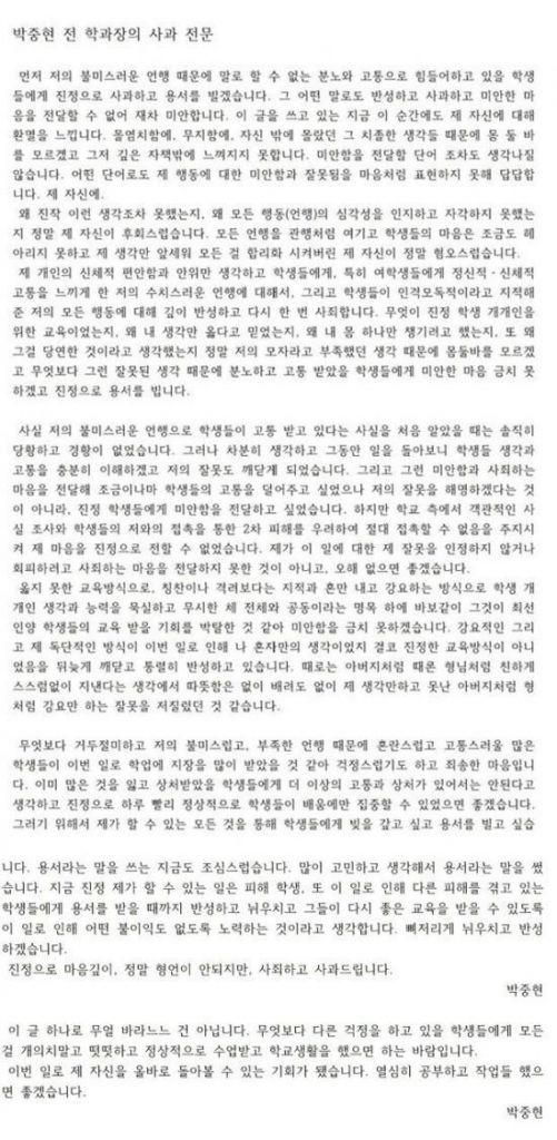 명지전문대 연극영상학과 전 학과장 박중현 교수가 성추문 논란에 사과했다.박중현 교수는 4일 ‘명지전문대학 대신 전해드립니다’ 공식 페이스북에 사과문을 게재했다.그는 “먼저 저의 불미스러운 언행 때문에 말로 할 수 없는 분노와 고통으로 힘들어하고 있을 학생들에게 진정으로 사과하고 용서를 빌겠습니다”라고 말문을 열었다. 이어 “몰염치함에, 무지함에, 자신밖에 몰랐던 그 치졸한 생각들 때문에 몸 둘 바를 모르겠고 그저 깊은 자책밖에 느끼지 못합니다”라며 후회했다.또 “무엇보다 거두절미하고 저의 부족한 언행 때문에 혼란스럽고 고통스러울 많은 학생이 이번 일로 학업에 지장을 많이 받았을 것 같아 걱정스럽기도 하고 죄송한 마음입니다”라며 “진정으로 마음 깊이, 정말 형언이 안 되지만, 사죄하고 사과드립니다”라고 덧붙였다.한편 앞서 이날 한 매체는 박중현이 학교 내 영상편집실을 안마방으로 개조해 여학생들을 불러들였다고 보도했다. 성추행 피해를 입은 학생들은 “우리는 그분의 전담 안마사였다”,“제 가슴이 박중현 교수 등에 맞닿게 누워서 눌러드려야 했습니다”라고 인터뷰하기도 했다.이번 논란으로 박중현 교수는 보직에서 해임 처리됐다.온라인이슈팀 issue@asiae.co.kr<ⓒ세계를 보는 창 경제를 보는 눈, 아시아경제(www.asiae.co.kr) 무단전재 배포금지>