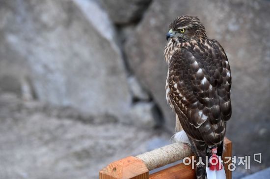 천연기념물 제323-1호, 참매가 11일 서울 중구 남산골한옥마을에서 열린 매사냥 체험 행사에서 멋진 자태를 뽐내고 있다. 참매는 먹이사슬의 정점에 위치한 포식자로서 매우 사나운 맹금류다. 대표적인 사냥매로서 꿩매라고도 부르며 나이와 모양에 따라 보라매, 수진이, 산진이 등 부르는 이름도 다르다. 특히 보라매의 경우 사람으로 치면 청소년기에 해당하여 동작이 매우 민첩하고 용맹해서 사냥매로서 인기가 좋다. /문호남 기자 munonam@<ⓒ세계를 보는 창 경제를 보는 눈, 아시아경제(www.asiae.co.kr) 무단전재 배포금지>