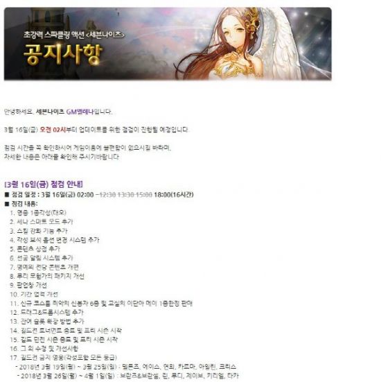 게임 ‘세븐나이츠’ 측이 공식 카페를 통해 점검 연장을 알렸다.16일 세븐나이츠 공식카페 측은 당초 이날 새벽 2시부터 오후 3시까지 점검을 진행할 예정이라 알렸지만, 오후 6시까지 점검시간을 연장했다고 공지했다. 점검내용은 영웅 1종각성(태오), 세나 스마트 모드 추가, 스킬 강화 기능 추가 등 17가지다. 한편 세븐나이츠 공식카페 측은 “점검 시간 동안 게임 이용이 어려운 점에 대해 양해를 부탁한다”고 밝혔다.온라인이슈팀 issue@asiae.co.kr<ⓒ세계를 보는 창 경제를 보는 눈, 아시아경제(www.asiae.co.kr) 무단전재 배포금지>
