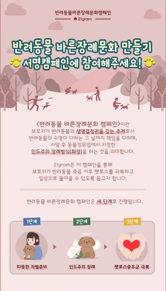 [아시아경제 손선희 기자] 반려동물을 기르는 사람이라면 분명 한 번은 숙명적으로 맞닥치게 되는 상황이 있다. 반려동물의 죽음이다. 가족처럼 지내던 반려동물을 잃고 한동안 슬픔에 빠지거나 나아가 죄책감에 시달리는 이른바 '펫로스 증후군'을 겪는 이들이 많다. 반려동물의 죽음, 어떻게 대처해야 할까.17일 스타트업 '21그램(21gram)'은 '반려동물 바른장례문화 만들기 캠페인'을 실시한다고 밝혔다. 반려동물이 사망한 경우 충분한 추모와 함께 동물장묘업에서 지정한 인도주의 장례방식(화장)을 안내하고, 보호자가 펫로스 증후군을 극복하고 일상으로 돌아올 수 있도록 돕는 캠페인이다.반려동물의 올바른 장례서비스를 제공하는 21그램은 이번 캠페인을 널리 알리기 위해 전날부터 오는 19일까지 서울 서초구 양재aT센터에서 열리는 '제23회 코리아펫쇼'에 참가한다. '반려동물 1000만' 시대를 맞아 반려동물의 죽음을 두려워하는 보호자에게 현장에 마련된 부스를 통해 올바른 장례절차를 위한 정보를 제공한다.캠페인은 총 세 단계로 구성됐다. 먼저 첫 단계는 '작별준비'로, 반려동물의 평균 수명을 인지하고 노령화됐을 때 필요한 지식을 공유한다. 두 번째 단계는 '인도주의 장례'다. 반려동물 장례 전문 상담을 통해 각 업체마다 제공되는 서비스를 비교해 보고, 본인이 원하는 장례서비스를 주체적으로 결정할 수 있도록 정보를 제공한다. 간혹 반려동물을 잃은 충격과 슬픔으로 과도한 장례비용을 들이는 경우도 발생하는 탓이다.캠페인의 마지막 단계는 '펫로스 증후군 극복'이다. 반려동물의 죽음에 따른 고통을 이해하고 이를 극복해 일상으로 잘 복귀할 수 있도록 돕는다.21그램 관계자는 "반려동물 보호자라면 꼭 고민해봐야 할 문제들"이라며 "관련 지식을 미리 습득하고 정보를 제공해 보호자가 가치판단을 할 수 있는 잣대의 기준을 마련하는 기회가 될 것"이라고 설명했다.손선희 기자 sheeson@asiae.co.kr<ⓒ세계를 보는 창 경제를 보는 눈, 아시아경제(www.asiae.co.kr) 무단전재 배포금지>