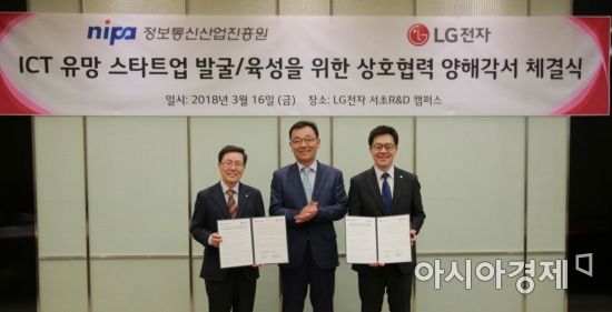 ▲지난 16일 서울 양재동 서초R&D캠퍼스에서 열린 협약식에서 (왼쪽부터)윤종록 정보통신산업진흥원장, 김용수 과학기술정보통신부 제2차관, LG전자 CTO 박일평 사장이 기념 촬영을 하고 있다. (제공=LG전자)