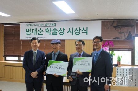 [아시아경제 이정옥 기자] 전남대학교 인문대학(학장 김양현·철학과 교수)과 한국어문학연구소(소장 김동근·국어국문학과 교수)가 공동으로 3월 21일(수), 인문대학 2호관 교수회의실에서 「범대순의 시와 시론」 출판기념회 및 범대순 학술상 시상식을 개최했다. 범대순 학술상 수상자로 전남대학교 신해진 국어국문학과 교수, 철학과 이중표 교수를 선정했다고 21일 발표했다.故범대순 교수는 시인이자 영문학자로 유고시집을 포함해 열여섯 권의 시집과 세 권의 시론집, 그리고 수많은 번역서와 연구서, 산문집 등을 남기고 2014년에 타계했다. 전남대학교 한국어문학연구소는 연구소 학술지 「어문논총」28호(2015. 12)에 범대순 특집을 기획하며 본격적으로 학술적 연구를 시작하였다. 그 결과물인 「범대순의 시와 시론」은 「어문논총」28호에 수록된 기존의 논문에 더해 여러 차례의 자체 세미나 과정을 통해 축적된 연구 논문들을 수록하고 있다.김동근 소장은 “이 책은 범대순의 시와 시론에 관한 연구 지형도의 첫 등고선을 그렸다는 데에 의의가 있다. 앞으로 많은 후속 연구들을 통해서 그의 시와 시론이 더 깊이 있게 해명되고, 한국 현대시 담론의 장으로 다양하게 확장되기를 기대한다.”라고 말했다.김양현 학장은 “범대순 시인의 장자인 범희승 교수(의과대학 핵의학과)의 물심양면의 지원이 있었기에 이와 같은 뜻깊은 자리를 마련할 수 있었다”라며 감사의 마음을 표했다.한편, 범대순 학술상은 전남대 인문대학 교수 중에서 최근 5년간 가장 많은 저역서를 출간한 2명에게 수여됐는데, 어문계열에서는 국어국문학과 신해진 교수, 역사철학계에서는 철학과 이중표 교수가 수상의 영광을 안았다.신해진 교수는 우리나라 고전 문헌의 번역 연구에서 전문성과 탁월성을 입증한 훌륭한 인문학자다. 17세기 민족수난기의 실기문헌, 한문필기류, 소설류, 몽유록계소설, 아주신씨가 문집 등을 역주 작업하여 50여 권의 책을 출간했으며, 최근 5년 동안 17권의 저역서를 출간하는 등 왕성한 학문적 성과를 산출했다.이중표 교수는 『아함의 중도체계』, 『현대와 불교사상』, 『불교와 일반시스템이론』, 『불교와 양자역학』 등 수 많은 저역술을 통해 불교의 교리체계를 다양한 시각에서 조명하고 불교를 현대적으로 해석하는 데 기여했다. 10년 전부터는 초기불경인 『5부 니까야』를 중도체계의 관점에서 역해하려고 노력해왔으며, 그 사이 「정선 디가 니까야」와 「정선 맛지마 니까야」를 완성하는 등 학문적 성실성과 탁월성을 평가받았다.한편, 광주시 북구 용강동 하신부락 생가에 자리 잡은 ‘범대순 시문학관’에는 고인이 소장했던 1만여 권의 책과 범대순전집을 비롯한 저작과 유품들이 보관되어 있다. 이 시문학관은 원래 2014년 2월 고인이 살고 있던 광주시 동구 계림동 자택 2층에 약 25평 규모로 마련했던 것인데, 계림동이 재개발됨에 따라 2017년 5월에 이전 개관한 것이다.광주=이정옥 기자<ⓒ세계를 보는 창 경제를 보는 눈, 아시아경제(www.asiae.co.kr) 무단전재 배포금지>