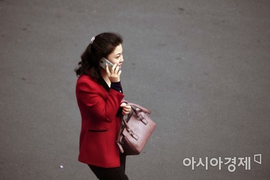 [포토] 휴대전화로 통화하며 걷는 북한 여성