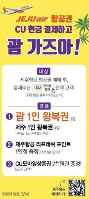 [아시아경제 심나영 기자] 편의점 CU가 LCC(저비용항공) 업계 1위 제주항공과 손잡고 2일부터 ‘CU-제주항공 편의점 결제 서비스’를 시작한다고 2일 밝혔다. 해당 서비스는 온라인에서 예약한 제주항공의 항공권을 전국 1만2600여개 CU에서 현금으로 간편하게 결제할 수 있는 서비스다. 이용방법은 제주항공 모바일 앱 또는 홈페이지를 통해 항공권 예약을 마친 후 ‘CU 편의점 결제’를 결제 수단으로 선택하고, 본인 휴대폰으로 발송된 수납 번호를 가까운 CU에 제시하면 된다.해당 서비스를 이용하면 외국인, 학생 등 신용카드 결제나 휴대폰 소액결제가 어려운 고객들도 굳이 여행사를 찾아가지 않고 가까운 CU에서 항공권을 결제할 수 있다. 또한, 번거로운 본인 인증 절차가 필요 없을 뿐만 아니라 별도의 수수료도 필요하지 않아 누구나 부담 없이 서비스를 이용할 수 있다. ‘CU-제주항공 편의점 결제 서비스’ 론칭을 기념해 4월 한 달 간 다양한 이벤트도 펼친다. 오는 30일까지 해당 서비스를 통해 항공권을 구매한 모든 고객들에게 CU 모바일 상품권(2000원)을 증정한다. 이벤트에 응모한 고객 중 추첨을 통해 제주 왕복 항공권(4명), 괌 왕복 항공권(1명)을 증정하며, 선착순 30명에게는 제주항공에서 현금처럼 사용 가능한 리프레시 포인트 1만점을 적립해 준다. 당첨자는 내달 14일 CU홈페이지에서 확인할 수 있다.심나영 기자 sny@asiae.co.kr<ⓒ세계를 보는 창 경제를 보는 눈, 아시아경제(www.asiae.co.kr) 무단전재 배포금지>