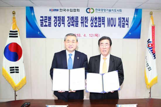 한국수입협회와 한국경영기술지도사회는 12일 서울 방배동 한국수입협회에서 중소 무역업체 지원을 위한 업무협약(MOU)을 체결했다. 사진 왼쪽부터 신명진 한국수입협회 회장, 송갑호 한국경영기술지도자회 회장