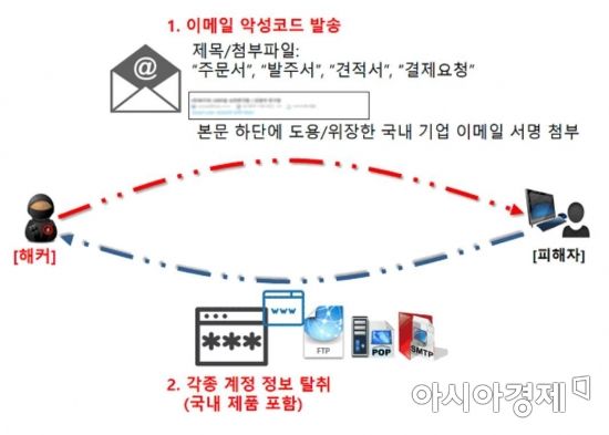 '[아시아경제 한진주 기자] 국내 기업들의 임직원 이메일 서명을 위장해 악성코드를 유포하는 공격 사례가 발견됐다.10일 하우리는 국내 대기업·중소기업의 임직원 이메일 서명을 도용해 이메일 하단에 서명을 첨부하고 악성코드와 함께 유포하는 이메일 공격 사례에 주의해야한다고 밝혔다.해당 이메일은 주로 '주문서', '발주서', '견적서', '결제요청' 등과 같은 제목과 첨부 파일로 발송되며 본문에는 한국어 또는 영문으로 관련된 내용이 적혀 있다.공격자는 수신자들을 속여 첨부파일 다운로드를 유도하기 위해 국내 기업들의 이메일 서명을 도용·위장했다. 이메일 서명은 메일 하단에 자신의 소속·연락처 등을 추가하는 것을 말한다.압축된 첨부파일에는 주로 문서로 위장한 실행파일이 포함돼있고 해당 실행파일을 실행할 경우 악성코드가 실행된다. 악성코드는 주로 PC에 저장되어 있는 웹 브라우저 및 원격 접속 프로그램(FTP) 등의 계정정보(서버주소, 아이디, 패스워드) 등을 수집해 원격에 있는 특정 서버로 전송한다. 공격자는 이렇게 수집한 정보를 토대로 2차 공격에 활용할 것으로 추정된다.또한 공격자는 해당 이메일 발송을 위해 국내 포털 이메일 서비스를 이용해 해당 메일을 발송하기도 한다. 위장한 송·수신자의 이메일 주소는 주로 인터넷 검색엔진을 통해 수집하고 있는 것으로 추정된다. 정부사이트에서 추출된 이메일들도 상당수 발견되고 있다.최상명 CERT 실장은 "공격자는 국내 기업들에 대한 정보를 수집해 공격에 활용하고 있으며 최근 관련 공격이 크게 증가하고 있다"며 "이메일 열람 전에 발신인에 이메일 전송 여부를 확인한 후 이메일을 열람해야 한다"고 말했다.한진주 기자 truepearl@asiae.co.kr<ⓒ세계를 보는 창 경제를 보는 눈, 아시아경제(www.asiae.co.kr) 무단전재 배포금지>