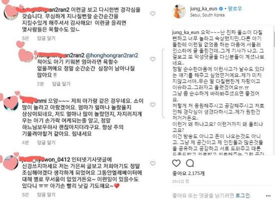 방송인 정가은이 SNS에 딸의 사고 글을 올린 것과 관련해 자신의 입장을 전했다.앞서 정가은은 18일 자신의 인스타그램에 “오늘 소이가 엘리베이터 문에 손이 끼는 사고가 있었다”며 딸이 사고 위험에 처했던 상황을 전했다. 그러면서 “주변 분들의 도움으로 소이 손을 조심스럽게 뺐고 엘리베이터 문틀과 문 사이 1센티 정도의 틈이 있어서 큰 상처로 이어지진 않았지만 정말 이번 일로 많은 걸 느꼈다. 아이와 함께 있을 때는 단 1초도 한눈팔면 안 된다는 거”라고 적었다.이를 본 일부 네티즌들은 정가은이 딸을 이용해 이슈몰이 하는 것 아니냐며 비난했고, 이에 정가은은 자신의 인스타그램에 다시 글을 올렸다. 그는 “소이가 다칠 뻔하고 너무 놀라고 속상했지만 다른 아기들한테 이런 일 없었음 하는 마음에 서둘러 인스타에 글을 올린 것”이라며 “정말 순수한 마음에 이런 사고가 날 수도 있다는 얘기를 해주고 싶었던 것”이라고 해명했다. 이어 “내가 미치지 않고서야 무슨 딸 다칠뻔한 게 자랑이고 이슈라고 그러자고 올렸겠는가. 그냥 좀 순수하게 바라봐주셨으면 좋겠다”는 바람을 전했다.또 그는 “저 응원해주시고 공감해주시고 저로 인해 경각심이 생겼다 하시고. 제가 원한 건 저런 것”이라며 딸의 사고 글을 올린 이유에 대해 설명했다.온라인이슈팀 issue@asiae.co.kr<ⓒ세계를 보는 창 경제를 보는 눈, 아시아경제(www.asiae.co.kr) 무단전재 배포금지>