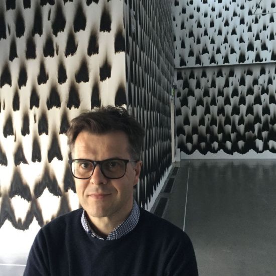 크리스티앙 자카르의 '그을음의 악보' 앞에 선 올리비에 들라발라드 도멘 드 케르게넥 미술관장. (사진=경기도미술관 제공)