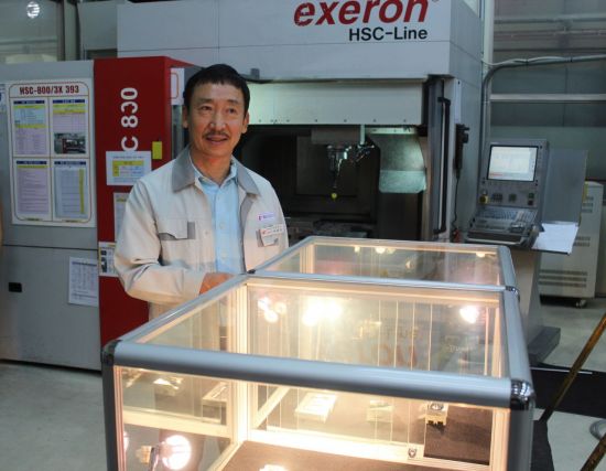 박화석 우성정공 대표가 생산공장에서 금형 가공 중인 제품을 가리키며 기술 경쟁력에 대해 이야기를 하고 있다.