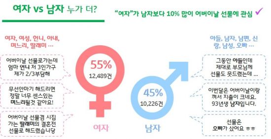 어버이날을 기념해 부모님께 선물하기 위해 여성이 남성보다 더 오래 더 많이 고민하는 것으로 나타났다. 어머니에게는 주로 화장품을, 아버지에게는 건강식품을 선물했다. 전체적으로 최고 인기 선물은 용돈이었다.SK텔레콤이 온라인 버즈량을 토대로 빅데이터를 분석한 결과, 어버이날 선물을 준비하는 시기가 해마다 조금씩 앞당겨지고, 여성이 남성보다 더 이른 시점부터 선물에 대해 고민하는 것으로 밝혀졌다.SK텔레콤은 어버이날 선물 트렌드를 파악하기 위해 자사의 소셜 분석 서비스 플랫폼 '스마트 인사이트'를 통해 빅데이터를 분석한 결과를 6일 발표했다.인터넷에서 어버이날 선물을 언급하는 시기는 매년 앞당겨지고 있다. 온라인 버즈량을 바탕으로 도출된 곡선을 분석한 결과, 어버이날 관련 키워드 언급량은 2016년 5월 8일 당일 최고치를 기록한 반면, 2017년에는 어버이날 7일 전에 최고수준을 기록했다. 올해는 어버이날 임시 공휴일 지정 등의 논의가 진행되면서 4월 초부터 어버이날에 대한 공중의 관심이 급증한 것을 확인할 수 있다.