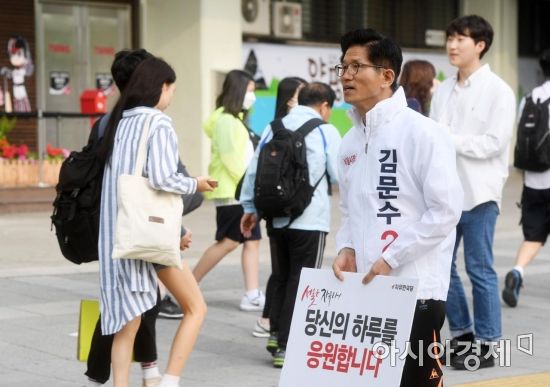 김문수 자유한국당 서울시장 후보가 1일 한국노총 2018 노동절 마라톤대회가 열리는 잠실올림픽주경기장 앞에서 시민들과 인사하고 있다. /문호남 기자 munonam@