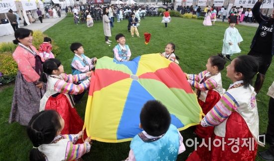 13일 서울 광화문광장에서 열린 '제17회 대한민국 서당문화한마당'에서 아이들이 협동제기 놀이를 즐기고 있다. 매년 전북 남원에서 진행돼 온 이 행사는 올해 처음 광화문에서 열렸다./김현민 기자 kimhyun81@<ⓒ세계를 보는 창 경제를 보는 눈, 아시아경제(www.asiae.co.kr) 무단전재 배포금지>