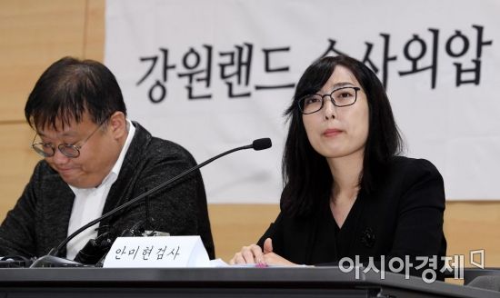 강원랜드 채용비리 수사 관련 외압 의혹을 폭로한 안미현 검사(오른쪽)가 15일 서울 서초구 변호사 교육문화회관에서 기자회견을 열고 그간 진행된 수사에 대한 입장과 의견을 제시하고 있다. 왼쪽은 김필성 변호사./김현민 기자 kimhyun81@<ⓒ세계를 보는 창 경제를 보는 눈, 아시아경제(www.asiae.co.kr) 무단전재 배포금지>