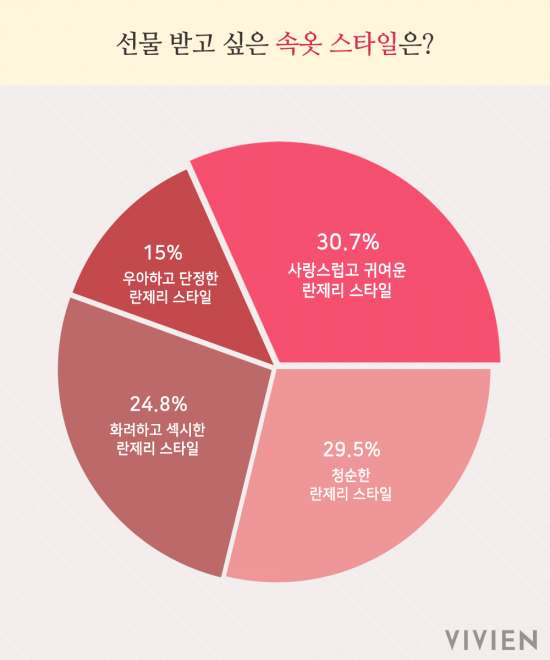 성년의 날에 받고 싶은 속옷 스타일로는 ‘사랑스럽고 귀여운 란제리’가 1위로 꼽혔다. 전체 응답자의 30.7%가 응답했다. 2위는 29.5%가 선택한 ‘청순한 란제리’였다. 3위는 24.8%가 선택한 ‘화려하고 섹시한 란제리’이며 4위는 15%가 선택한 ‘우아하고 단정한 란제리’로 나타났다.
