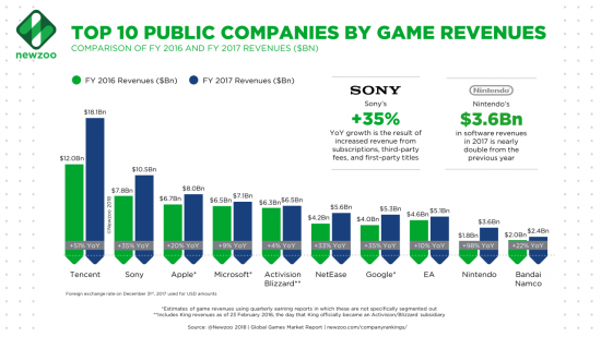 [아시아경제 손선희 기자] 글로벌 게임시장에서 상위 25개 게임사가 전체 시장의 77%를 점유한 것으로 나타났다. 중국 텐센트(Tencent)가 압도적 매출 및 성장세를 보이며 5년째 부동의 1위 자리를 지켰다.18일 미국 시장조사업체 '뉴주(Newzoo)'가 분석한 보고서에 따르면 지난해 글로벌 게임시장 규모는 총 1217억 달러(약 131조6000억원)로 추산됐다. 텐센트를 필두로 글로벌 상위 25개(매출 기준) 게임사가 전년에 비해 29% 성장한 941억달러의 매출을 올리면서 전체의 약 77.3%를 차지했다.텐센트는 지난해 181억달러의 매출을 올려 5년째 1위 자리를 지켰다. 전체 시장 규모의 약 14.8%에 달하는 규모다. 전년(120억달러)에 비해 50% 늘어 규모뿐 아니라 성장세로도 경쟁사를 압도하며 격차를 더욱 벌렸다. 일본 소니(Sony)는 105억달러의 매출로 2위에 올랐고 애플(80억달러), 마이크로소프트(71억달러), 액티비전 블리자드(65억달러) 순이었다. 상위 5개사 순위는 전년과 같았다.상위 25개 게임사 중 디즈니(8억7000만달러, 4% 감소)를 제외한 모든 기업이 전년에 비해 매출 성장을 이뤘다. 특히 모바일 게임의 강세가 두드러졌다. 톰 위즈먼 뉴주 컨설턴트는 "지난해 모바일 게임 매출이 큰 폭의 성장을 보여 상위 25개 기업 중 13개 기업 매출의 대부분을 차지했다"며 "유통 플랫폼을 소유한 애플이 80억달러에 달하는 게임 매출로 전 세계에서 세 번째로 큰 게임 회사가 됐다"고 분석했다.페이스북은 지난해 '브라우저 기반' 게임 이용자가 지속적으로 줄면서 25위권 밖으로 밀려났다. 이에 따라 페이스북은 인스턴트 게임 플랫폼을 통해 '하이퍼 캐주얼 게이머'를 공략하는 전략으로 전환하고 있다고 보고서는 분석했다.10위권 내에 들진 못했으나 '리니지' 지식재산권(IP)으로 가파른 성장세를 보이고 있는 넷마블ㆍ엔씨소프트 등 한국 업체의 성과도 조명됐다. 위즈먼은 "엔씨소프트는 '리니지M'이 흥행하면서 25개 기업 중 가장 가파른 성장세를 보였다"며 "넷마블도 '리니지2레볼루션' 성공에 힘입어 절반 이상의 수익을 한국 외 지역에서 벌어들였다"고 설명했다.손선희 기자 sheeson@asiae.co.kr<ⓒ세계를 보는 창 경제를 보는 눈, 아시아경제(www.asiae.co.kr) 무단전재 배포금지>