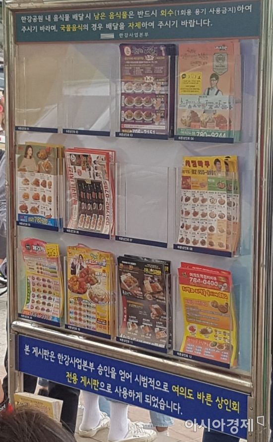 [아시아경제 김민영 기자]지난 11일 오후 5시께 서울 여의도 한강공원. 지하철 5호선 여의나루역 인근에 있는 한 배달존에서 전단지 게시판을 놓고 상인들끼리 험한 말이 오갔다. 한 여성은 “이 게시판은 상인회 것이니까 다른 게시판에다 꽂으면 되잖아. 이건 우리 거야”라고 말했다. 그랬더니 한 남성이 “누구 마음대로 상인회 거래. 한강사업본부에 물어봤는데 아무나 써도 된다던데”라고 받아쳤다. 다른 상인들이 싸움을 말려 다행히 더 큰 일은 벌어지지 않았다.사진=김민영 기자