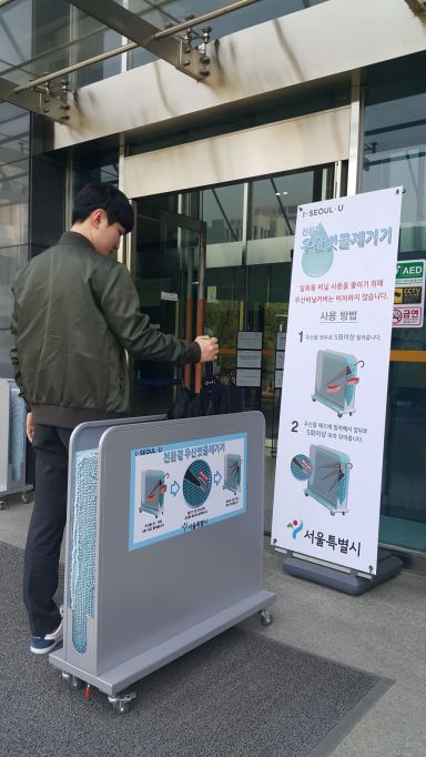 ▲건물 앞에 설치된 친환경 우산 빗물제거기. 흡수력이 뛰어난 특수 소재가 부착돼 있어 우산을 넣고 문지르면 쉽게 빗물을 닦을 수 있다.