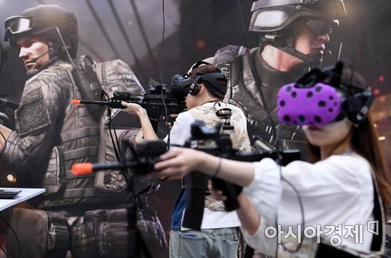 23일 서울 강남구 코엑스에서 열린 '월드 IT쇼 2018'에서 방문객들이 VR 게임을 즐기고 있다./김현민 기자 kimhyun81@