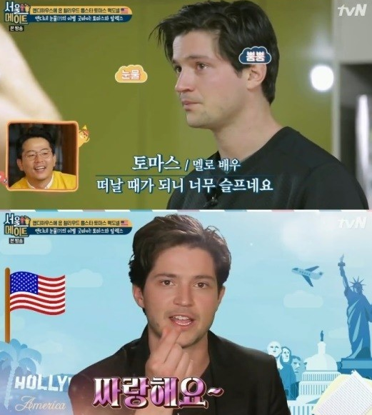 26일 방송된 Olive, tvN ‘서울메이트’에서는 앤디 하우스서 마지막 날을 보낸 할리우드 배우 토마스 맥도넬과 뮤지션 알렉스 프랭클의 모습이 공개됐다.이날 방송에서 두 사람은 서울에서의 마지막 일정을 보낸 후 지난 3박4일 간의 추억을 떠올려 시청자들의 눈길을 끌었다.토마스와 알렉스는 서울 여행 중 가장 기억에 남는 것으로 숯가마와 지하상가 레코드점, 백남준 아트센터 등을 꼽았다.방송에 패널로 출연한 개그우먼 김숙, 개그맨 김준호, 가수 소유, 배우 이이경 등은 이들의 여행을 보며 “서울에 저런 곳도 있었어?”라고 말하기도 했다.또한 앤디가 준비한 한글 프린팅의 옷과 모자를 입은 두 사람은 한국을 떠나는 공항에서 선물 받은 옷을 입고, 모자를 쓰는 모습을 보이기도 했다.한편 두 사람은 방송에서 각각 도말숙(토마스), 안래숙(알렉스)으로 불리며 시청자들의 웃음을 자아냈다.온라인이슈팀 issue@asiae.co.kr<ⓒ세계를 보는 창 경제를 보는 눈, 아시아경제(www.asiae.co.kr) 무단전재 배포금지>