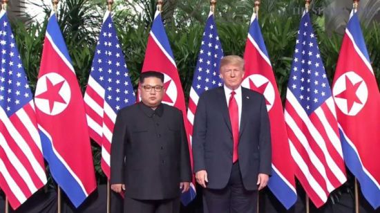 12일 오전 싱가포르 센토사 섬 카펠라호텔 회담장에서 만난 트럼프 미국 대통령과 김정은 북한 국무위원장 모습. 이날 김 위원장은 남북정상회담 때와 마찬가지로 인민복 차림으로 등장해 세계 언론의 관심을 받았다(사진=연합뉴스)
