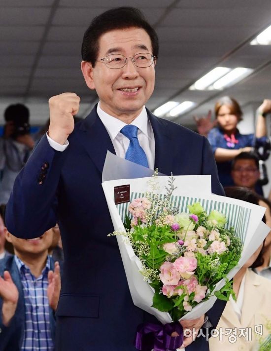 6.13 지방선거에서 서울시장으로 당선된 박원순 더불어민주당 후보가 꽃다발을 들고 지지자들에게 인사를 하고 있다./윤동주 기자 doso7@