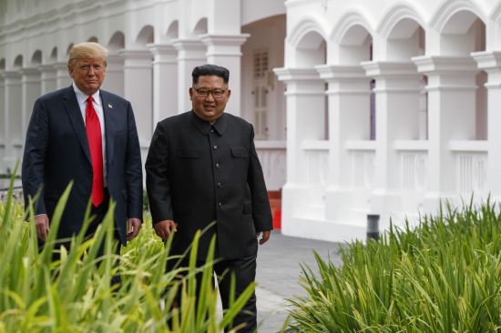 지난 12일 싱가포르 카펠라 호텔에서 트럼프 미국 대통령과 김정은 북한 국무위원장이 산책하고 있다. [이미지출처=AP연합뉴스]