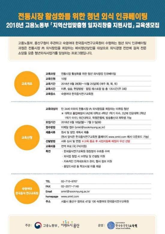 교육 내용은 ▲외식업 트렌트 변천사 ▲관련 법규 ▲상권분석 ▲메뉴기획 등 이론 교육(41시간)과 전통 한식, 캐주얼 한식, 카페·브런치 메뉴를 아우르는 조리실습 교육(79시간)으로 나뉜다.그 외 유명 전통시장과 밤도깨비 야시장 등 현장에서 상인들의 음식을 체험하고 전문가 의견도 들어볼 수 있다.참여를 원하는 이는 6월18일부터 7월31일까지 교육원 이메일(smkf@sookmyung.ac.kr)로 원서와 창업계획서를 제출하면 된다. 관련 양식은 교육원 홈페이지(www.smkf.com)에서 내려 받을 수 있다.교육원은 1차 서류심사와 2차 면접심사를 통해 교육생을 선발하되 사업자등록 예정자를 우선 선발한다는 방침이다. 국·구비 지원으로 교육비는 전액 무료다.구는 교육 수료생을 대상으로 지속적 관리를 이어간다. 특히 지역 내 용문, 후암 전통시장 등에 창업이 될 수 있도록 직간접적으로 돕는다. 교육(수료)인원 중 7명(70%) 이상 창업이 목표다.성장현 용산구청장은 “고용부 지원을 받아 숙대와 함께 청년 외식 인큐베이팅 사업을 벌인다”며 “교육을 내실 있게 운영하고 청년 실업 해소에 힘을 보탤 것”이라고 전했다.용산구 일자리경제과(☎2199-6794) 또는 한국음식연구교육원(☎710-9767)박종일 기자 dream@asiae.co.kr<ⓒ세계를 보는 창 경제를 보는 눈, 아시아경제(www.asiae.co.kr) 무단전재 배포금지>