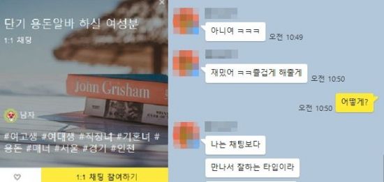 [아시아경제 허미담 기자] “즐겁게 해줄게”, “나는 만나서 잘하는 타입이라…”18일 오전 기자가 직접 카카오톡 오픈채팅방에 들어가 받은 메시지 내용이다. 자신을 20대 남성이라고 소개한 A 씨는 “어디에 사냐”, “미성년자냐”며 노골적으로 조건만남을 요구했다. 대화를 이어나가자 기자와 만남 장소, 금액 등 성매매 요건을 제시했다. 기자가 아니라 실제 성매매를 하고자 하는 여학생이었다면 이 남성과의 성매매는 불과 몇분 사이에 모두 진행되는 상황이었다. 스마트폰으로 불특정 다수와 익명으로 대화할 수 있는 ‘익명 채팅방’이 성매매, 불법 음란물 공유 등 각종 범죄의 온상이 되고 있다. 특히 익명 채팅방은 성인인증 없이 누구나 접근할 수 있어 청소년들의 성매매를 알선한다는 지적이 나오고 있다.익명 채팅의 한 종류인 카카오톡 오픈채팅방에서의 ‘은밀한 대화’는 청소년에게 쉽게 노출돼있다. 오픈채팅방은 익명성이 전제돼있고, 별도의 본인인증 절차를 거치지 않는다. 실제로 이날 오픈채팅방에 ‘성인’이라고 검색한 결과, ‘성인 놀이터’, ‘남친 여친 몰래 나누는 대화’ 등 자극적인 제목으로 개설된 채팅방이 눈에 띄었다. 채팅방 검색을 위해 마련된 해시태그에도 19, 여자만, 성인만 등이 쓰여 있었다. 이와 관련해 카카오 측은 한 매체를 통해 "성매매나 음란물을 방지하기 위해 금칙어를 적용하고 모니터링을 강화하고 있다"고 강조했다. 또 연령대 제한이 없는 것에 대해서는 “카카오톡 가입 시 전화번호 외 인증절차를 거치지 않아 연령대에 따른 제한을 두기 어렵다”고 해명했다.사진=연합뉴스