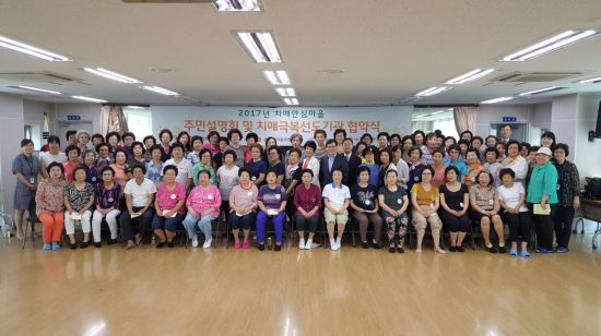 [아시아경제 박종일 기자] 성동구(구청장 정원오) 성동구치매지원센터는 20일 금호푸르지오1차아파트를 ‘성동구 제1호 치매안심인증기관’으로 지정할 것이라고 19일 밝혔다.이번에 ‘성동구 제1호로 치매안심인증기관’으로 지정할 금호3가 소재 금호푸르지오1차아파트는 6월20일 입주자대표회장과 금호2,3가동 주민센터에서 아파트주민 50여명이 참석한 가운데 업무협약을 맺을 것이다. 협약 후 치매지원센터장(허재혁, 서울의료원 신경과 전문의)의 ‘치매의 이해’와 관련된 교육을 아파트 주민 50여명(입주자대표, 관리소장, 통장, 노인회, 부녀회, 주민 등)을 대상으로 실시 후 ‘성동구 제1호 치매안심인증기관“으로 지정할 예정이다.협약에 앞서 치매환자와 가족이 안심하고 생활할 수 있는 치매안심마을 조성을 위한 간담회를 실시했다. 그 결과 성동구는 아파트 입주민과 함께 ▲만 60세 전후 어르신을 위한 ‘두근두근 뇌 운동’ 치매예방교실을 운영 ▲치매조기발견을 위한 만75세 이상 어르신의 치매조기검진 홍보 ▲주기적인 ‘치매예방교육’과 ‘치매인식개선캠페인’을 추진할 것을 계획했다.