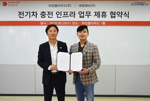 스마트주차솔루션 전문기업 파킹클라우드(대표 신상용)와 전기자동차 충전기 전문기업 대영채비(대표 정민교)가 지난 6월 20일 양평동 소재 파킹클라우드 본사에서 전기차 충전기 인프라 구축 및 업무 제휴를 위한 협약식을 진행했다.파킹클라우드와 대영채비는 주차와 전기차 충전 서비스 각 분야에서 주목을 받고 있으며 양사 모두 빠른 성장세를 보이고 있다. 양사는 이번 전략적 제휴 업무 협약을 통해 전기차 충전기 인프라 확대는 물론이고 신규 비지니스 모델 발굴 등의 지속적인 발전을 도모할 수 있을 것으로 기대한다고 밝혔다.스마트주차솔루션 아이파킹을 운영하고 있는 파킹클라우드는 주차장소유주-운영자-이용자간 실시간 연결 플랫폼을 제공하고 있으며, 최근 1,000호점을 돌파했다. 또한, 국내에서 유일하게 구축된 전국 지사와 국내 최대 규모의 개발 연구 인력, CS 및 AS 인력을 바탕으로 빠르게 성장 중이며, 국가 공공시설 및 지차체의 주차 통합 사업도 지속적으로 수주하며 성공적으로 완수하고 있어 2018년도 말에는 2,000호점을 달성할 것으로 예상된다고 업체 관계자는 전했다.그리고 운전자 대상으로 전담 매니저가 관리하는 검증된 실시간 주차 정보를 제공하고, 앱에서 다양한 제휴처와의 프로모션 및 포인트 결제 등을 통한 주차비 할인 서비스도 제공한다.한편 국내 최대 충전기 제품군을 보유한 대영채비는 설비 제조는 물론이고 설치, 관제 운영, 고객 관리, A/S에 이르기까지 충전 원스톱 서비스를 제공하며, 단 2년 만에 전기차용 완속ㆍ급속 충전기 4,000대 수주를 돌파하여, 국내 전기차 충전기 선두업체로 도약했다.또한, 국내 최초로 전기차 충전기 고효율에너지기자재인증 취득하여 전력수급 안정화에 기여했을 뿐만 아니라, 현대자동차, 르노삼성, 테슬라, BMW 등 국내외 유명 완성차 제조사와 충전인프라 협력사로 선정되었으며, 2018년 3월에는 환경부(한국환경공단) 충전기 운영사업자로 선정되는 등 다양한 분야에서 전기차 충전 인프라 보급사업을 확대 중이다.이용수 기자 mark@asiae.co.kr<ⓒ세계를 보는 창 경제를 보는 눈, 아시아경제(www.asiae.co.kr) 무단전재 배포금지>
