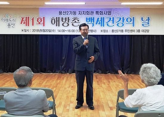 [아시아경제 박종일 기자] 용산구 북동쪽 남산자락 용산2가동은 ‘해방촌’이란 이름으로 더 많이 알려져 있다. 8.15 광복과 한국전쟁 이후 도시 난민과 월남인들이 이곳에 터를 잡았다.해방촌의 고민 중 하나는 급속한 고령화다. 전체 주민 1만2333명명 중 2001명(16.2%)이 65세를 넘긴 ‘어르신’이다. 구 전체 고령자 비율(15.1%)보다 1% 가량이 높다. (2018년 1·4분기 기준)용산구(구청장 성장현) 용산2가동주민센터(동장 정재희)가 고령화시대에 발맞춰 ‘백세건강의 날’을 운영, 눈길을 끈다.첫 번째 행사는 지난 20일 오후 1시30분 동주민센터 3층 대강당에서 열렸다. 지역 내 65세 이상 어르신과 자원봉사자, 성장현 용산구청장 등 150여명이 참석한 가운데 식전공연, 개회식, 축하공연, 특강 순으로 행사가 진행됐다.소월어린이집 원생들의 재롱잔치로 어르신 얼굴에 웃음꽃이 피었고 동 자치회관 기타교실의 통기타 공연과 강유정 강사의 만수무강 노래교실이 행사장 분위기를 한껏 고조시켰다.동주민센터 인근 한의원을 운영하는 김호선 원장은 ‘중풍·치매·노화 방지를 위한 운동방법’ 특강을 벌여 박수를 받기도 했다.