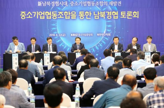 이번 토론회는 지난 21일부터 23일까지 열린 '2018 중소기업 리더스 포럼' 행사의 일환으로 마련했다.박성택 중소기업중앙회 회장은 인사말을 통해 "북한이 정상국가가 된다면 중소기업에게는 새로운 기회가 되지 않을까 생각한다"며 "북한에 대한 투자나 진출이 개별기업보다는 업종별로 공동으로 대응해서 투자하고 거기 인력들도 활용하면서 다양한 공동방식을 모색하는게 어떻겠냐는 이유에서 이번 토론회 자리를 만들었다"고 말했다. 이어 "이번 토론회를 통해 중소기업들이 중국에서 동남아로, 동남아에서 인도까지 가는 항로를 바꿔 북한으로 정착하는 길을 만들어주길 바란다"고 덧붙였다.토론회에는 조봉현 위원을 비롯해 김병로 서울대 통일평화연구원 교수, 이종욱 서울여대 경제학과 교수, 한재권 한국패션칼라산업협동조합연합회 회장, 임강택 통일연구원 선임연구위원, 김상훈 중소기업연구원 연구위원, 박천조 개성공업지구지원재단 부장이 참여했다.김병로 교수는 "북한 경제 시스템 자체는 우리가 아는 것과 달리 중앙집권적이지 않고 지역분산적이며 200개의 섹터로 돼 있다"고 강조했다. 이어 "지역과 협력할 필요가 있고 그것이 중소기업협동조합 같은 모델로 들어가는 건 아주 적절한 방법으로 잘 작동할 것으로 보인다"며 "근본적 변화가 지금 한반도에 일어나고 있는데 기업인들이 이러한 흐름을 타고 잘 준비하길 바란다"고 말했다.이종욱 교수는 "남북경협은 대기업형 투자모델과 중소기업형 교류협력 모델로 나눠 추진해야 한다"며 "중소기업형 교류협력 모델은 중기부가 전담해서 체계적으로 지원할 필요가 있다"고 주장했다.