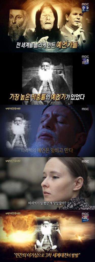 MBC 예능프로그램 ‘신기한TV 서프라이즈’에서 한 예언가가 세계 3차대전을 예고해 화제다.24일 방송된 MBC 예능프로그램 ‘신비한TV 서프라이즈’에서는 90% 이상의 적중률을 보인 예언가 미타르 타라빅에 대한 이야기가 전해졌다.이날 방송에서 미타르 타라빅은 세계에서 가장 유명한 예언가 노스트라다무스, 21세기 최고의 예언가 쥬세니로 노부레를 놀라게 할 만한 예언가로 소개됐다.미타르 타라빅은 예언서를 통해 “비뚤어진 십자가를 한 누군가에 의해 유럽 전체가 위기에 빠진다”라고 히틀러 등장을 예언했다. 이 외에도 그는 1차 세계대전, UN, TV, 석유개발에 대해서도 예측하기도 했다.타라빅의 예언이 맞아떨어지자 사람들은 그의 예언을 주목하기 시작했다. 특히 사람들이 주목하는 예언 중 하나는 “두 번째 전쟁이 끝나고 많은 이들이 신이 아닌 인간의 지능을 믿는다. 결국 또 전쟁이 일어난다”며 “전쟁이 끝나면 오랜 평화가 찾아온다. 동양의 현자가 나타날 것”이라고 3차 세계 대전을 예고한 부분이다.온라인이슈팀 issue@asiae.co.kr<ⓒ세계를 보는 창 경제를 보는 눈, 아시아경제(www.asiae.co.kr) 무단전재 배포금지>
