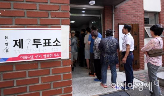 제7회 전국동시지방선거 및 국회의원 재ㆍ보궐선거일인 13일 서울 노원구 상계1동 제7투표소인 극동늘푸른아파트 경로당에서 유권자들이 투표를 위해 줄지어 있다./김현민 기자 kimhyun81@