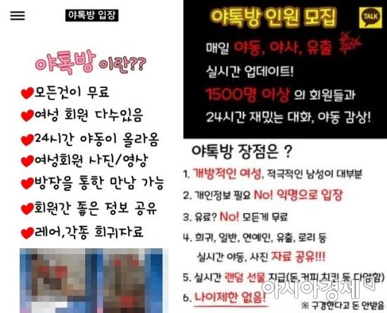 [아시아경제 송승윤 기자] 평소 틈날 때마다 음란사이트를 찾던 직장인 J(32)씨는 이제 더 이상 음란사이트를 찾지 않는다. 자주 찾던 사이트들이 차례로 폐쇄된데다가 새로운 음란물 공유처도 생겼기 때문이다. J씨가 음란물을 보는 곳은 다름 아닌 카카오톡 메신저다. 일명 ‘야톡방(음란물 등을 공유하는 카카오톡 오픈 채팅방)’이라고 불리는 채팅방에서 음란물을 찾아보는 게 J씨의 일상이 됐다. J씨는 “요즘은 유명한 음란 사이트들이 폐쇄되거나 차단되는 일이 잦아 카카오톡에서 야동(야한 동영상)을 본다”며 “실시간으로 회원들과 소통도 할 수 있고 보고 싶은 자료도 요청할 수 있어 사이트보다 편리하다”고 넌지시 귀띔했다.정부가 몰카(몰래카메라) 등 불법 촬영 범죄와 불법 음란물 유통에 대한 전쟁을 선포하면서 유명 음란사이트가 잇따라 폐쇄되거나 운영자가 구속되는 등 가시적 성과가 나오고 있지만 음란물 공유는 형태를 바꿔 더욱 은밀한 곳으로 파고들고 있다.최근 카카오톡이나 네이버 라인 등에서는 단체 채팅방을 이용해 음란물을 공유하는 이른바 ‘야톡방’이 유행처럼 퍼지고 있다. 야톡방은 약 5~6년 전부터 생겨났다. 대부분 음란 사이트나 커뮤니티 등에서 비밀리에 소규모로 회원을 모집하곤 했지만 최근에는 네이버 등 포털 사이트나 SNS(소셜네트워크서비스) 스폰서 광고 등을 통해 광고를 내걸면서 불특정 다수의 회원을 모집 중이다.실제 운영 중인 '야톡방' 채팅화면(사진=카카오톡 오픈채팅방 화면 캡처)
