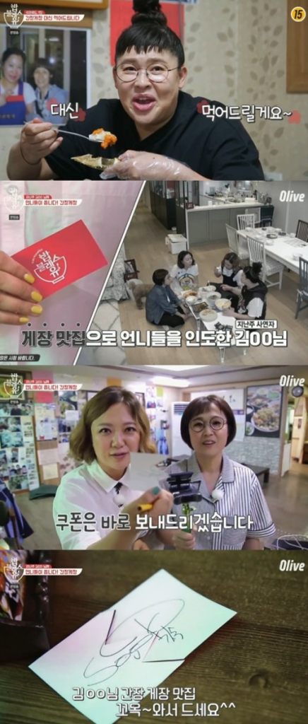 5일 방송된 Olive ‘밥블레스유’에서 사연을 보낸 시청자에게 간장게장 맛집 쿠폰을 전해 이목이 쏠리고 있다.이날 방송에서 방송인 최화정, 김숙, 이영자, 송은이 등은 김숙이 추천한 서울 마포에 한 간장 게장 맛집을 방문했다.이영자는 간장게장 집에 도착한 후 위생장갑을 끼며 먹을 준비를 마쳤다. 이후 음식이 등장하자 최화정은 “이럴 때 두 개씩 먹으면 큰일 난다. 내가 먼저”라고 말하며 음식을 시식했다.이어 “뷰티풀”이라고 말하며 음식을 극찬해 시청자들의 웃음을 자아냈다.이영자는 “이 집 진짜 잘한다”며 “언니 금수강산이 보인다”고 말했다. 이어 “간장게장은 그동안 아버지가 해준 것만 먹었다”며 “아버지한테 그동안 속았다”고 덧붙였다.이후 김숙은 간장게장을 먹고 ‘밥블레스유’ 로고가 새겨진 종이 한 장을 꺼내 사인을 했다. 이는 앞서 출연진들을 간장게장 집으로 이끈 사연의 주인공에게 줄 쿠폰이었다.사연의 주인공은 전 남자친구에게 큰돈을 빌려줬지만, 헤어지면서 받지 못했다는 사연을 보낸 바 있다. 김숙은 쿠폰을 식당 사장님에게 전달하며 “꼭 잘 보관해달라”고 당부해 시청자들의 눈길을 끌었다.온라인이슈팀 issue@asiae.co.kr<ⓒ세계를 보는 창 경제를 보는 눈, 아시아경제(www.asiae.co.kr) 무단전재 배포금지>